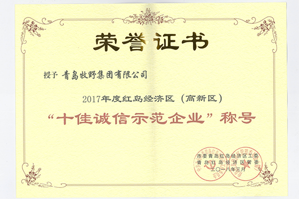 青島牧野集團有限公司獲得市委青島紅島經濟區工委、青島紅島經濟區管委聯合授予的2017年度紅島經濟區(高新區)“十佳誠信示范企業”稱號